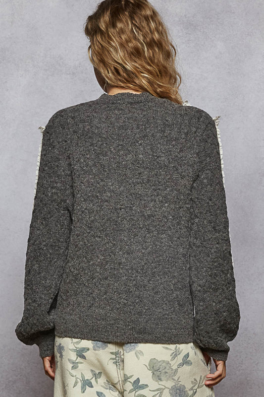 Designed in round neck, balloon sleeve, regular fit top in acrylic sweater with lace trim detail pointed solid pattern.