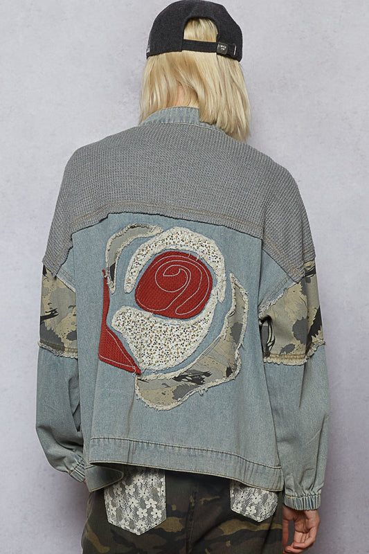 Designed in mock neck balloon sleeve roomy fit jacket in denim with rose embroidery and patchwork.