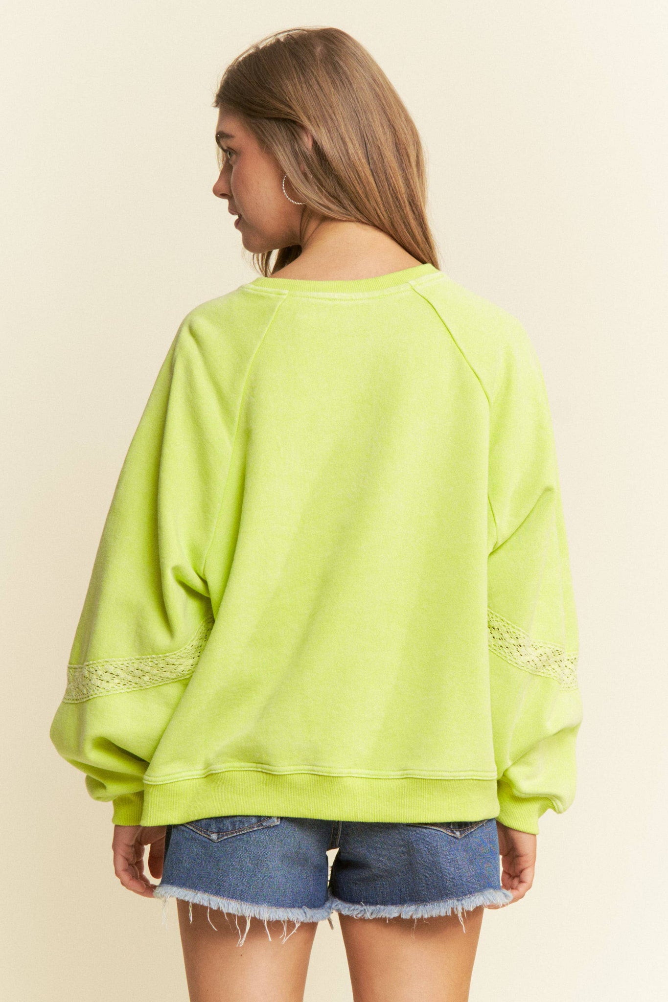 Women's cotton blend mineral washed oversize pull-over sweater with crochet lace trim details. The mineral wash gives our every piece a unique subtle washed pattern. Ribbed sleeve cuff, bottom hem and neckline.