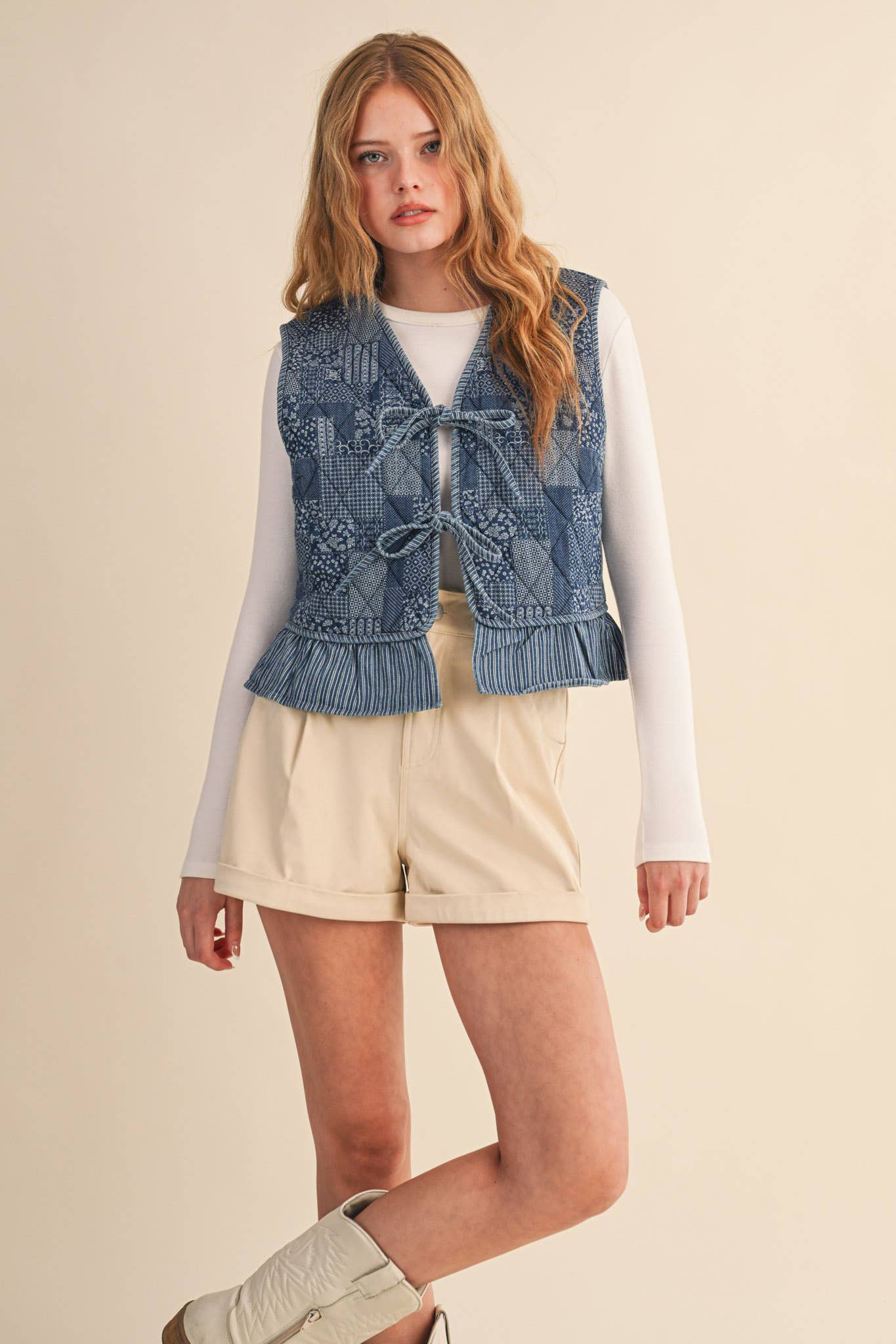 Quilted printed demin ruffle trim vest. V neckline with Open front and double bow front closure. Fully lined.